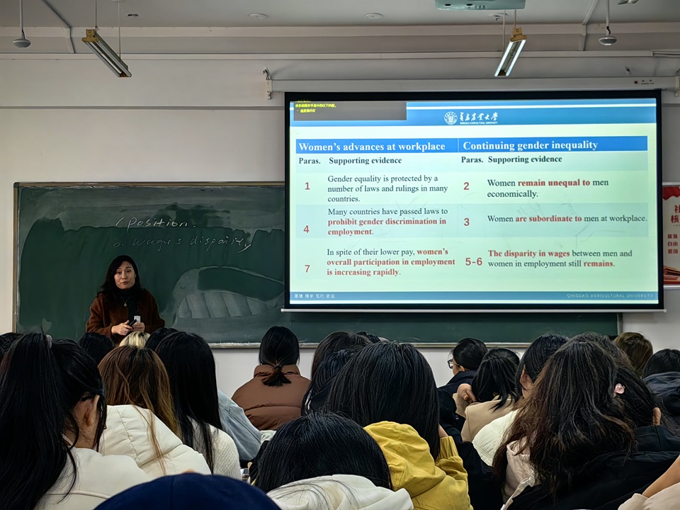 课堂上,聂庆娟以全球男女薪资为主题,通过生动的案例分析,采用海螺AI、在学习通中设置讨论的教学方式进行互动讨论,深入浅出地讲解了不同文化背景下男女薪资差异。这种教学方式丰富了课堂内容,调动了同学们学习积极性,也增强了学生口语交际能力,课堂气氛活跃,同学们踊跃发言,达到了良好教学效果。