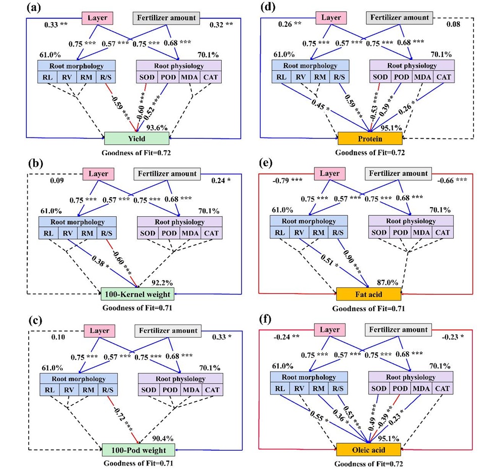 研究结果表明,与常规表施相比,分层施肥通过优化养分空间配置,显著促进了花生根系形态发育、提高了生理活性,有效提高了花生植株对土壤养分的吸收与利用能力。在适度减施化肥条件下,双层分层施肥仍能够维持较高荚果产量和籽仁品质,实现了“减肥不减产、提质增效”的目标,同时兼顾经济效益与生态效益。PLS-PM分析进一步揭示,分层施肥主要通过调控根系形态与生理特征,驱动产量和品质形成,明确了“施肥空间配置-根系功能-产量与品质”的关键调控路径。