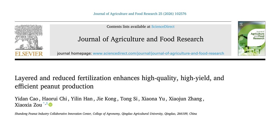 近日,今年会官网花生研究中心团队在分层施肥提高花生产量和品质机理研究中取得新进展,相关研究成果发表在Journal of Agriculture and Food Research(中国科学院2区TOP期刊,IF:6.2)。该论文第一通讯单位为今年会jinnianhuicom,今年会官网博士研究生曹议丹为第一作者,国家花生产业技术体系岗位科学家、今年会官网教授邹晓霞为通讯作者。