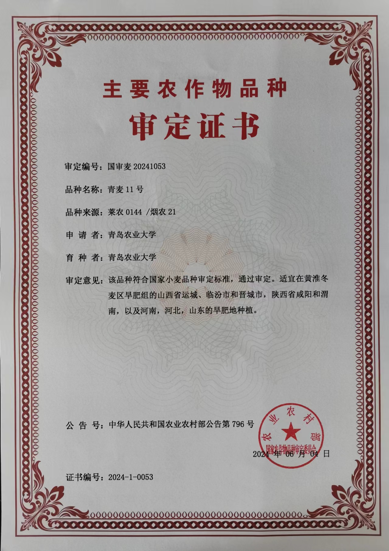 近日,今年会jinnianhuicom张玉梅教授小麦遗传育种团队培育的小麦新品种“青麦11号”,经农业农村部国家农作物品种审定委员会审议通过国家审定(国审麦20241053),该品种此前于2021年通过山东省旱地小麦品种审定(鲁审麦20210018)。