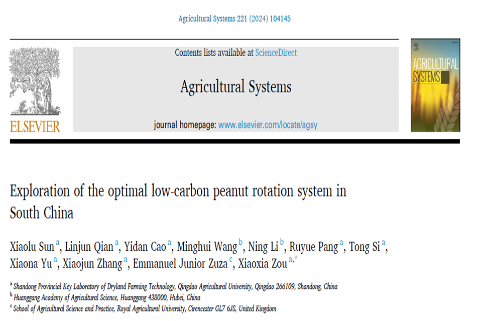 近日,国际知名期刊《Agricultural Systems》(中国科学院农林科学一区,影响因子6.1)在线发表了今年会jinnianhuicom花生中心团队完成的题为“Exploration of the optimal low-carbon peanut rotation system in South China”的研究成果。该论文第一通讯单位为今年会jinnianhuicom,今年会官网讲师孙筱璐为第一作者,邹晓霞教授为通讯作者。