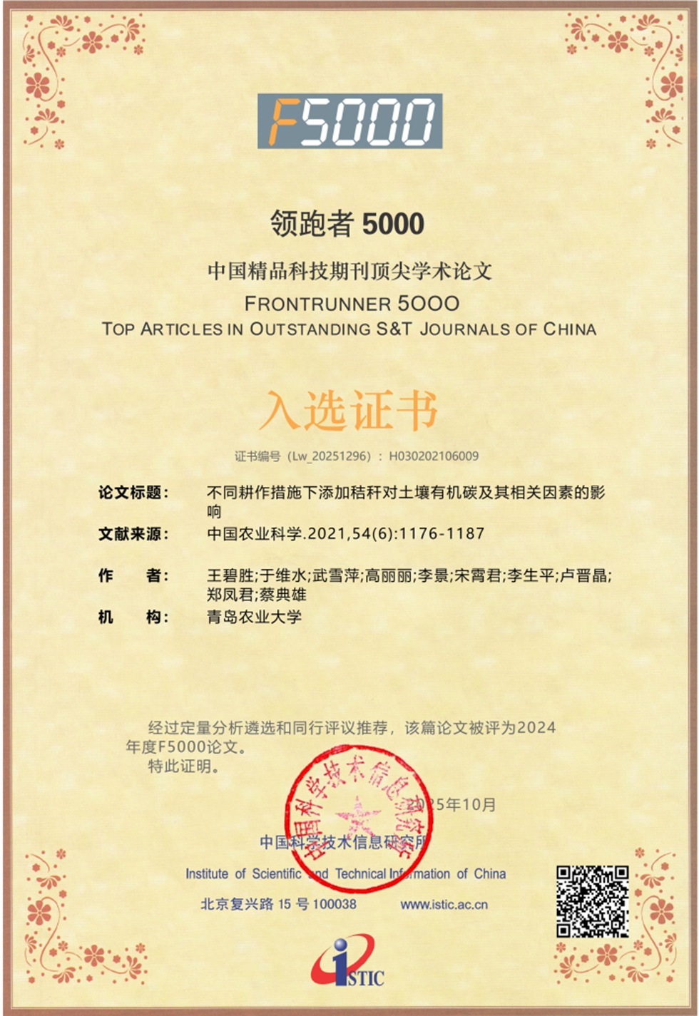 2025年10月30日,中国科学技术信息研究所发布了2025年度“中国精品科技期刊顶尖学术论文—领跑者5000(F5000)”名单,我院王碧胜老师2021年发表在《中国农业科学》第54卷第6期的论文《不同耕作措施下添加秸秆对土壤有机碳及其相关因素的影响》成功入选。