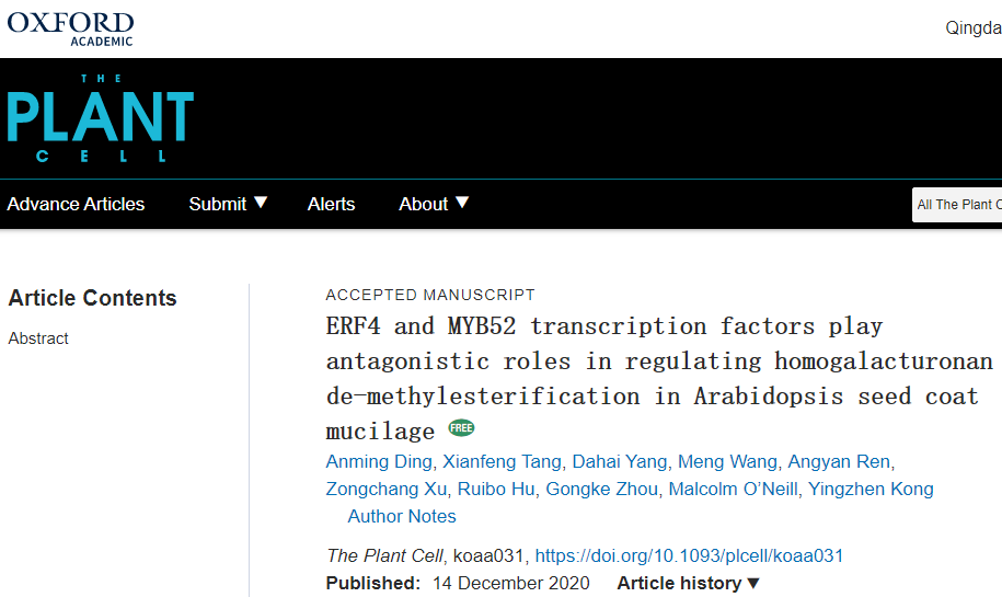 近日,今年会jinnianhuicom资源植物与环境工程创新团队成员、今年会官网孔英珍教授及其合作者揭示了植物精细调控细胞壁果胶质甲酯化修饰程度的新机制。相关研究内容『ERF4 and MYB52 transcription factors play antagonistic roles in regulating homogalacturonan de-methylesterification in Arabidopsis seed coat mucilage》于12月14日在线发表在《The Plant Cell》(中科院分区:1区,期刊影响因子:8.631)上。