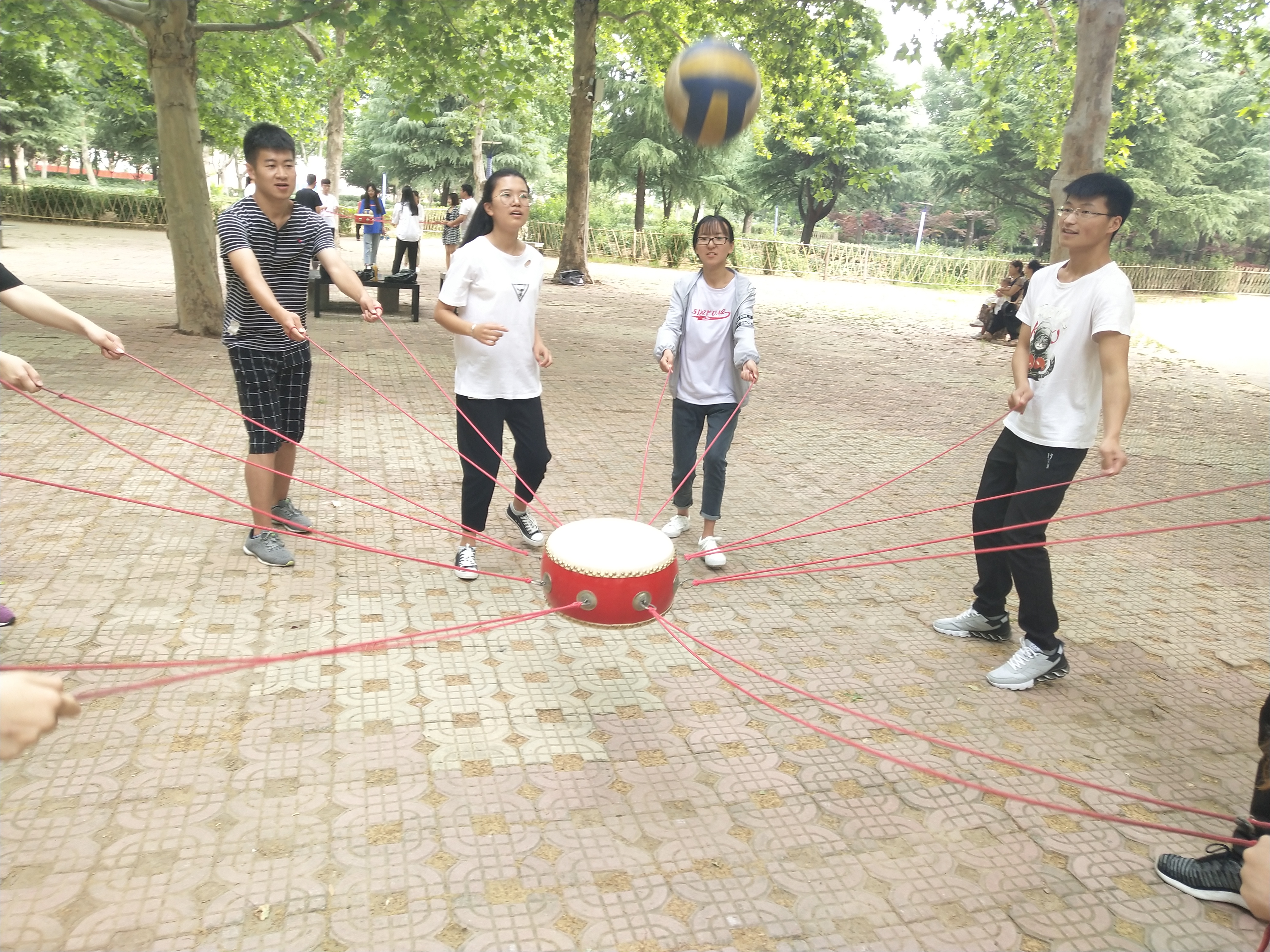活动伊始,张玉梅简单讲解了本次活动的意义,随后同学们开始进行热身游戏—无家可归,三轮热身活动过后,大家熟络了起来,现场气氛也更加活跃。接着,同学们按照要求依次分成六个小组,进行了“一鼓作气”和“盲站”两个游戏。“一鼓作气”要求每个小组的成员用鼓共同击打一个排球,一分钟内击打个数多的队伍获胜。“盲站”则是把六个小组分成两个大组,所有人都要蒙住眼睛,两组人需要分别把两根绳子围成一个正方形,这两个游戏在不同方面引导学生。“一鼓作气”要求小组成员齐心协力,劲往一处使;“盲站”则需要彼此之间互相信任,互相给予安全感。最后,大家就本次活动表达感受,同学们纷纷表示自己受益匪浅。