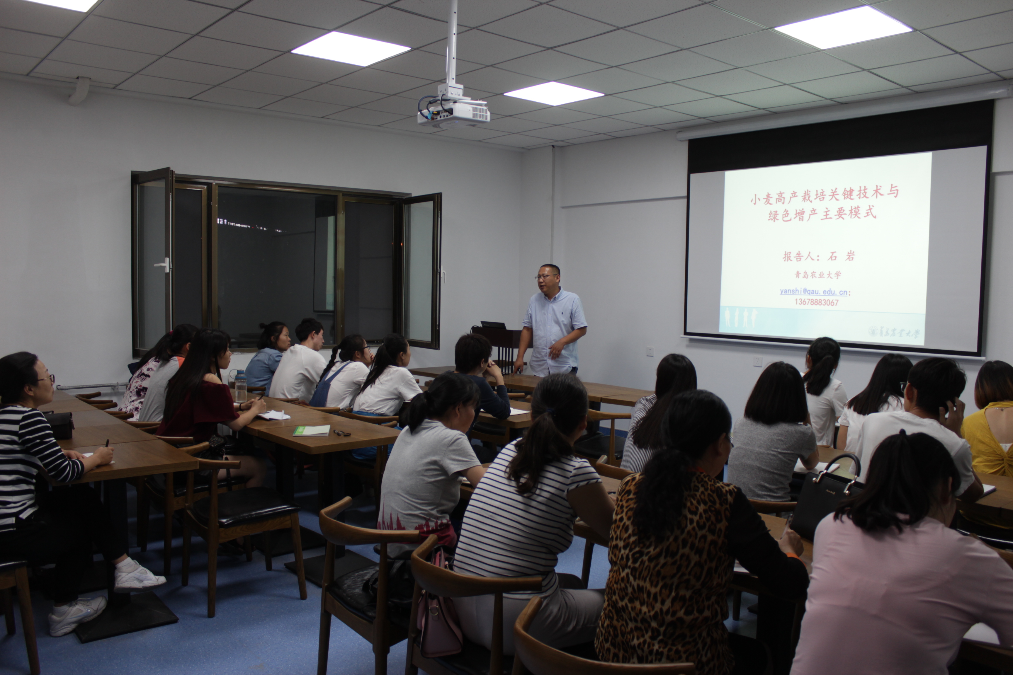 石岩做了题为“小麦高产栽培关键技术与绿色增产主要模式”的报告,主要从小麦绿色的增产理念、技术途径和绿色增产模式三个方面全景式的向老师同学们展示了如何建立小麦绿色增产模式。在报告过程中,石岩列举了招远高产创建、中裕一二三产业结合模式,用实例告诉同学们什么是绿色增产模式。