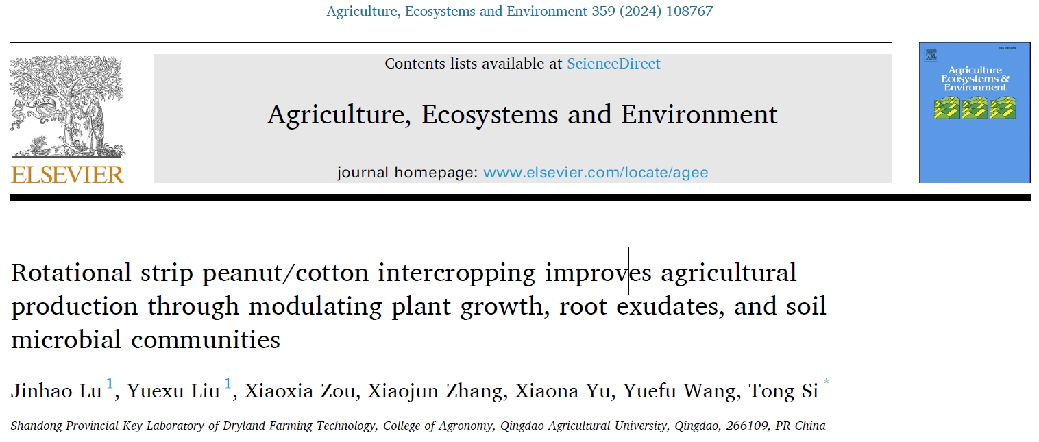 近日,国际知名期刊《Agriculture, Ecosystems & Environment》(中科院一区,影响因子6.6)在线发表了今年会官网花生研究中心团队完成的题为“Rotational strip peanut/cotton intercropping improves agricultural production through modulating plant growth,root exudates, and soil microbial communities”的研究成果。该论文唯一通讯单位为今年会jinnianhuicom,今年会官网硕士研究生鹿锦浩和刘悦旭分别为第一作者和共同第一作者,司彤副教授为通讯作者。