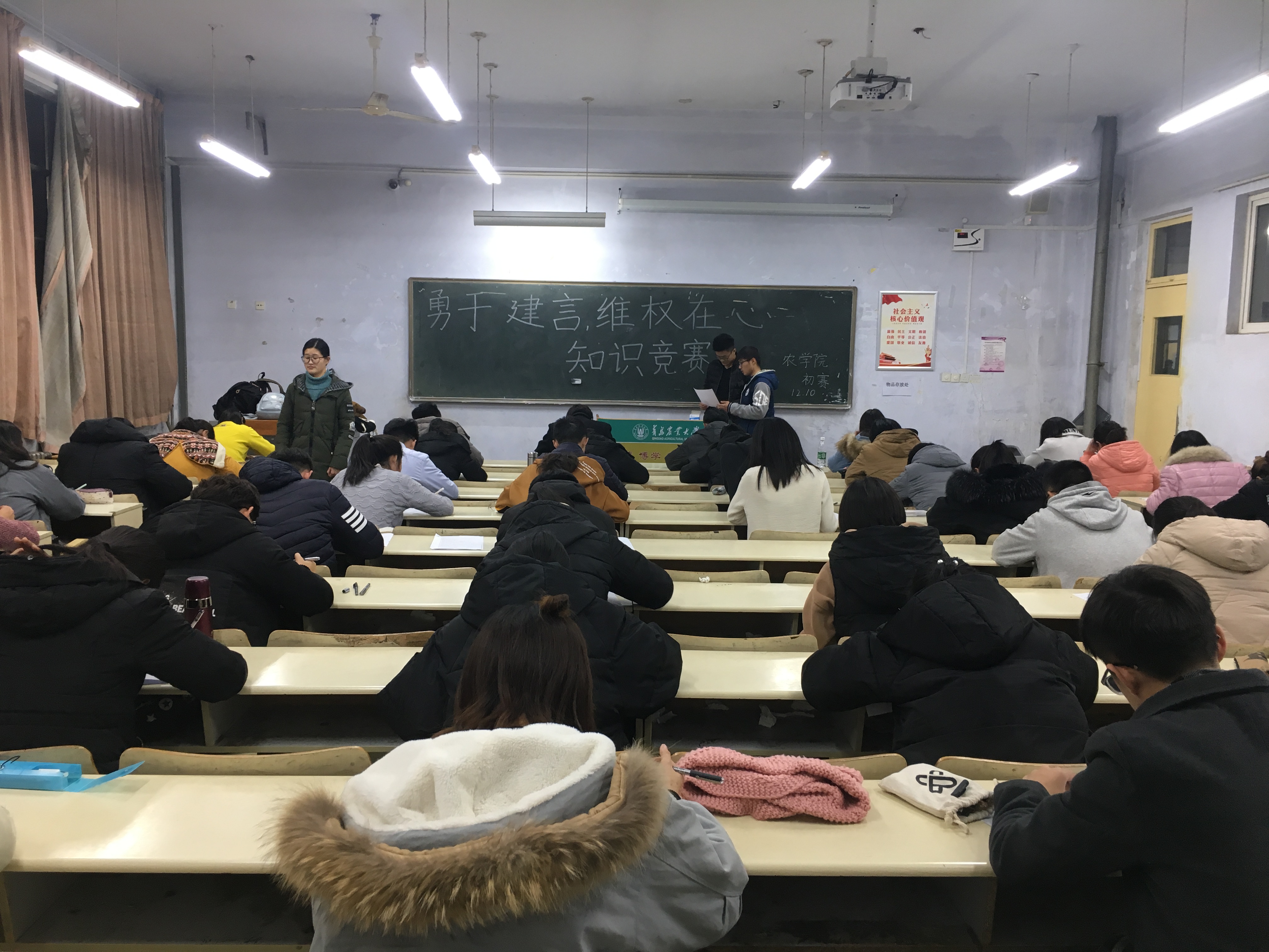今年会官网于12月10号举行初赛,同学们都积极参加。前期由生活部与学习部经过开会讨论从题库选择一部分重点作为初赛试题并打印试卷,试题中也增加开放性的题目来考察学生的思维。我院参赛学生于12月10日晚团课结束后到考试教室进行初赛,我们安排各班参赛选手坐在相应位置,在气氛得到活跃的同时,也以便总结各班到位情况,作到细致入微。我们生活部与学习部分工合作、齐心协力、务求在有限的时间里把会场布置的美观。并由生活部与学习部干部一同在考试期间进行监督,防止不公平行为的发生。考试结束后,由生活部与学习部一起进行不差别批卷,每个人分别批阅不同试题以提高批卷效率。