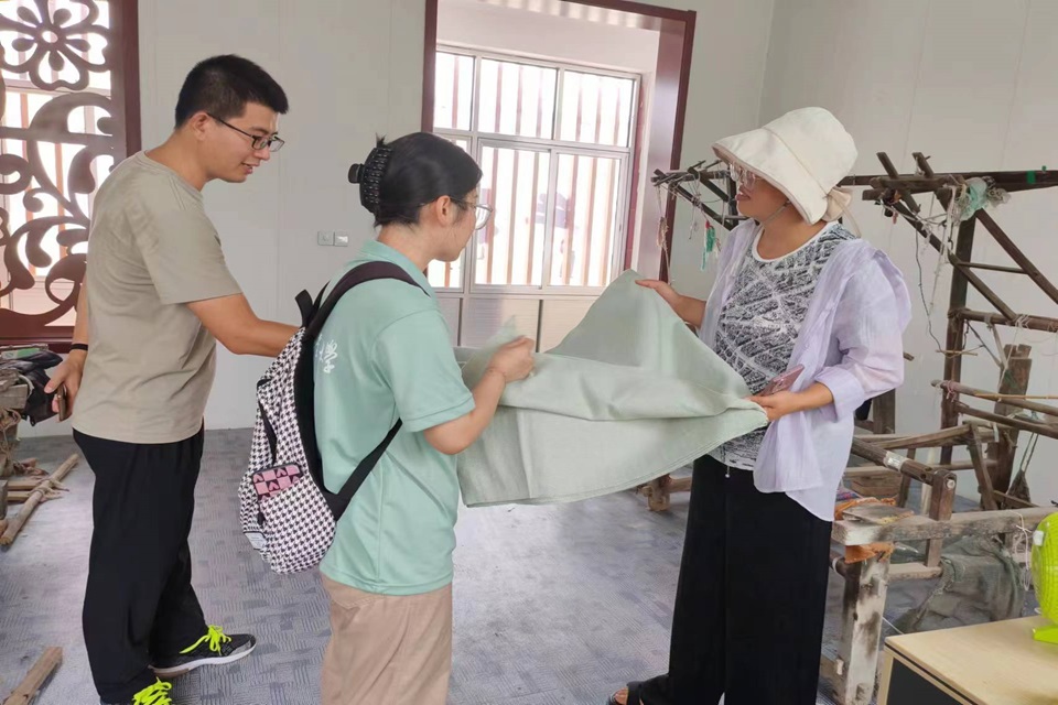 李屋村村委会成员向实践服务团成员们介绍当地的非遗文化产品——老粗布,指出受限于销售渠道辐射能力弱、人工制作成本高、市场定位不明确、宣传营销力度欠佳等问题,导致这一非遗文化产品的推广面临挑战,希望实践服务团成员们能够凝聚年轻一代的创新精神和活力,为老粗布的宣传发展扩宽视角。村委会成员带领实践服务团成员们前往由李屋村为民合作社打造的“巾帼创业基地”——“汇绢纺”,实践服务团成员们通过亲身操作,体会到从选线、染色到织造等每一个步骤的繁琐与精细,同时被织布工艺所展现的工艺美学和匠心精神等独特魅力所吸引,认识到加强老粗布宣传工作的必要性。