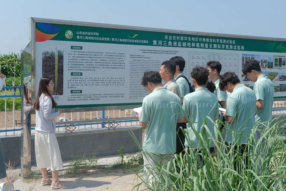 省农科院黄河三角洲现代农业研究院工作人员对实践服务团的到来表示热烈的欢迎,详细介绍了研究院在支持黄三角农高区建设与发展中所发挥的重要作用,以及围绕盐碱耕地质量提升、耐盐碱适生作物育种、盐碱地高效利用和农业生态安全等方面开展的科研创新和成果转化工作的整体情况。在工作人员的引导下,实践服务团成员前往园区内黄河三角洲盐碱地种植制度长期科学观测试验场实地调研。实践服务团了解到,省农科院大力推动“以种适地”与“以地适种”相结合,加快选育耐盐碱特色品种,充分挖掘盐碱地综合利用潜力,提高农业综合生产能力。实践服务团成员们认真聆听讲解员的讲解,就盐碱地作物种植、盐碱地土壤改良等方面的内容进行积极提问,与专家们进行了广泛的交流和探讨。