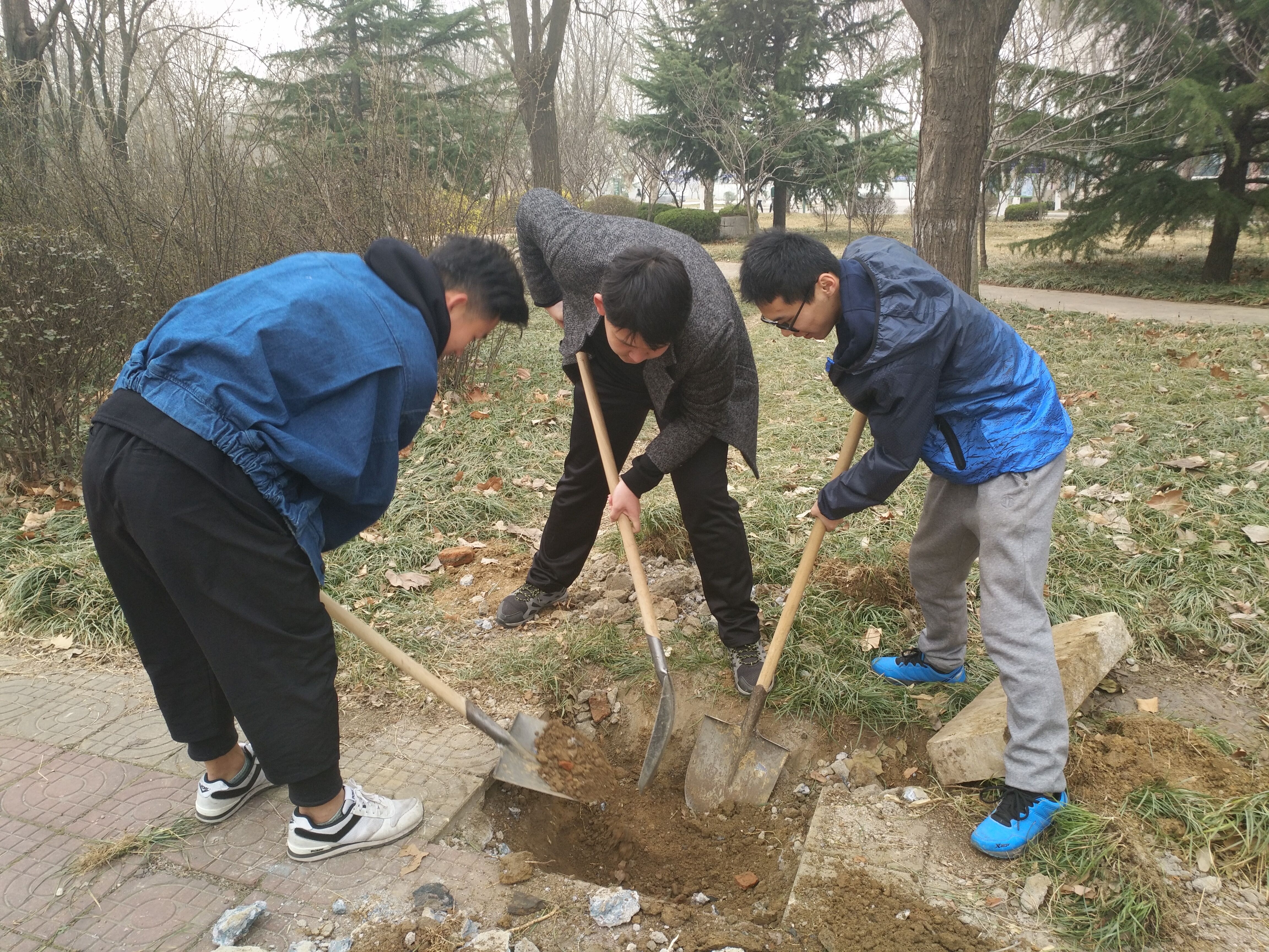 同学们怀着愉悦的心情来到书苑西路集合完毕,任务分配完成后,大家热情高涨。活动中,男生们纷纷挽起衣袖,拿起锄头、铲子为一棵棵新树苗安置“新家”。随后女生们有序地加入了植树的行列,手持铁锹和水桶,干劲十足,将一棵棵充满生机和希望的树苗植入土里。大家看着那一片自己亲手种下的树苗在微风中摇曳,无不露出满足的笑容,并与小树苗进行了合影,在一片欢声笑语中,植树活动圆满结束。
