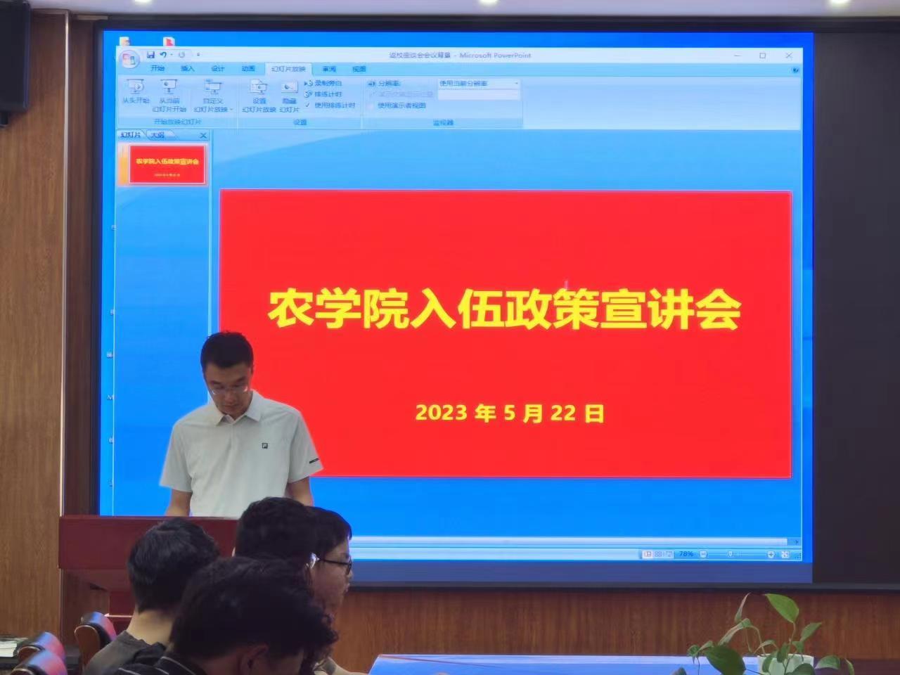 为加强征兵政策宣传,深入做好2023年大学生征兵工作,5月22日,今年会jinnianhuicom在生物楼召开入伍政策宣讲会。学院党委副书记、副院长孙占伟,辅导员李宪翔及2019级男生参加会议。会议由辅导员李宪翔主持。