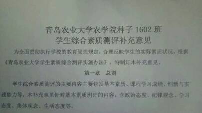 《学生综合素质测评补充意见》是由本班班委参与制定,其主要目的是为了让基本素质测评打分有据可依。本补充意见主要围绕着政治态度(团课的组织和管理)、纪律观念(早操、违纪)、学习态度(早读、上课、晚自习)、集体观念、生活态度几方面,它针对班级现状对同学们的学习、生活进行详细的规定。此意见的制定可以进一步落实《学生手册》,根据本班情况完善班级管理,同时提高同学们的自主性、自觉性,加大基本素质测评的公平力度,使同学们对自己本学期的综合表现更加明确。公布之后同学们也表示了自己的认同与支持。