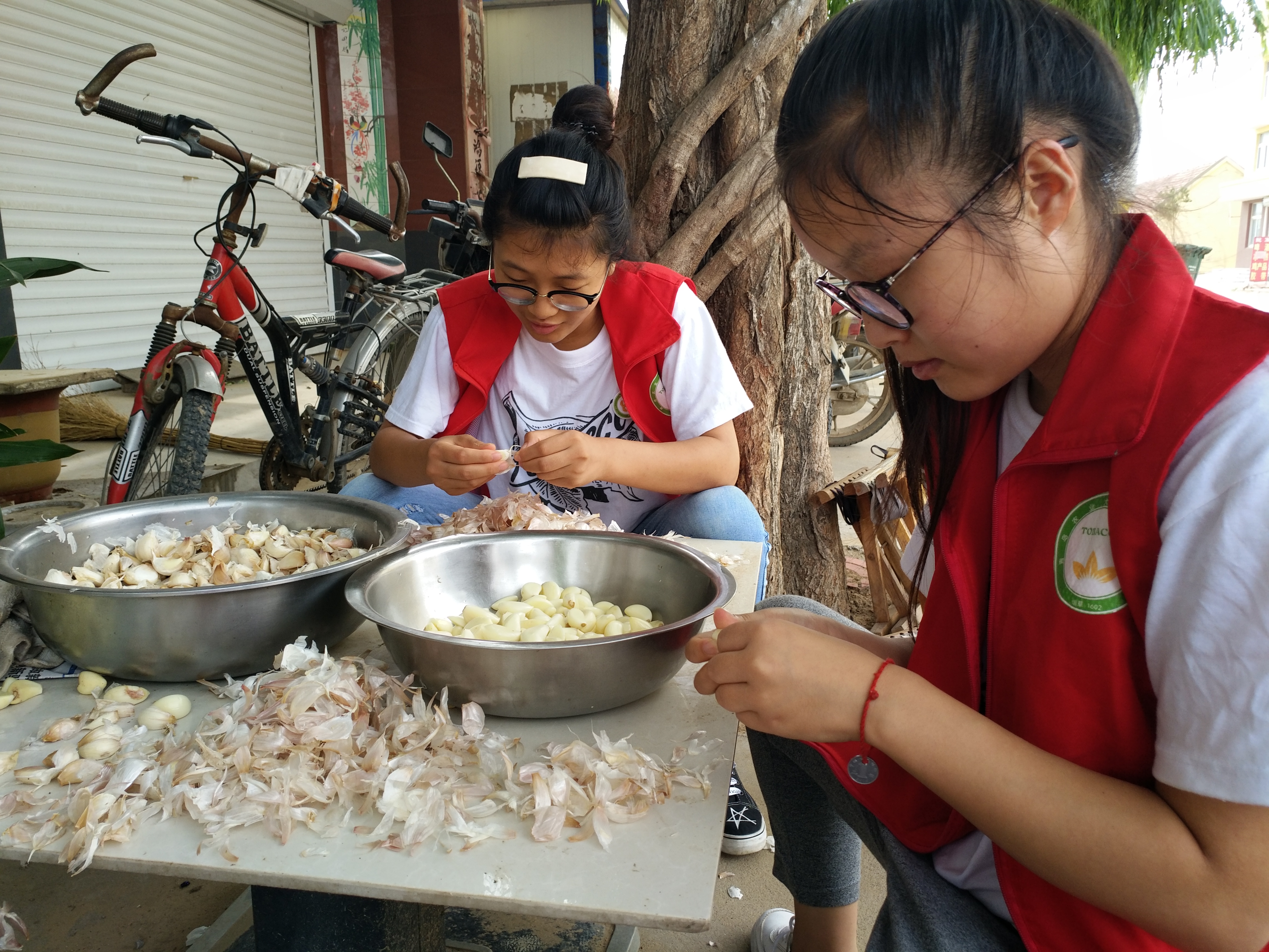 女生们在帮敬老院的厨房阿姨做厨前的准备,剥蒜、择菜,这不仅帮助厨房阿姨节约了时间,也锻炼了我们的动手能力。男生们也积极地帮敬老院中小果园中的葡萄套袋,这是很多人的第一次,但大家都会尽全力做到最好。