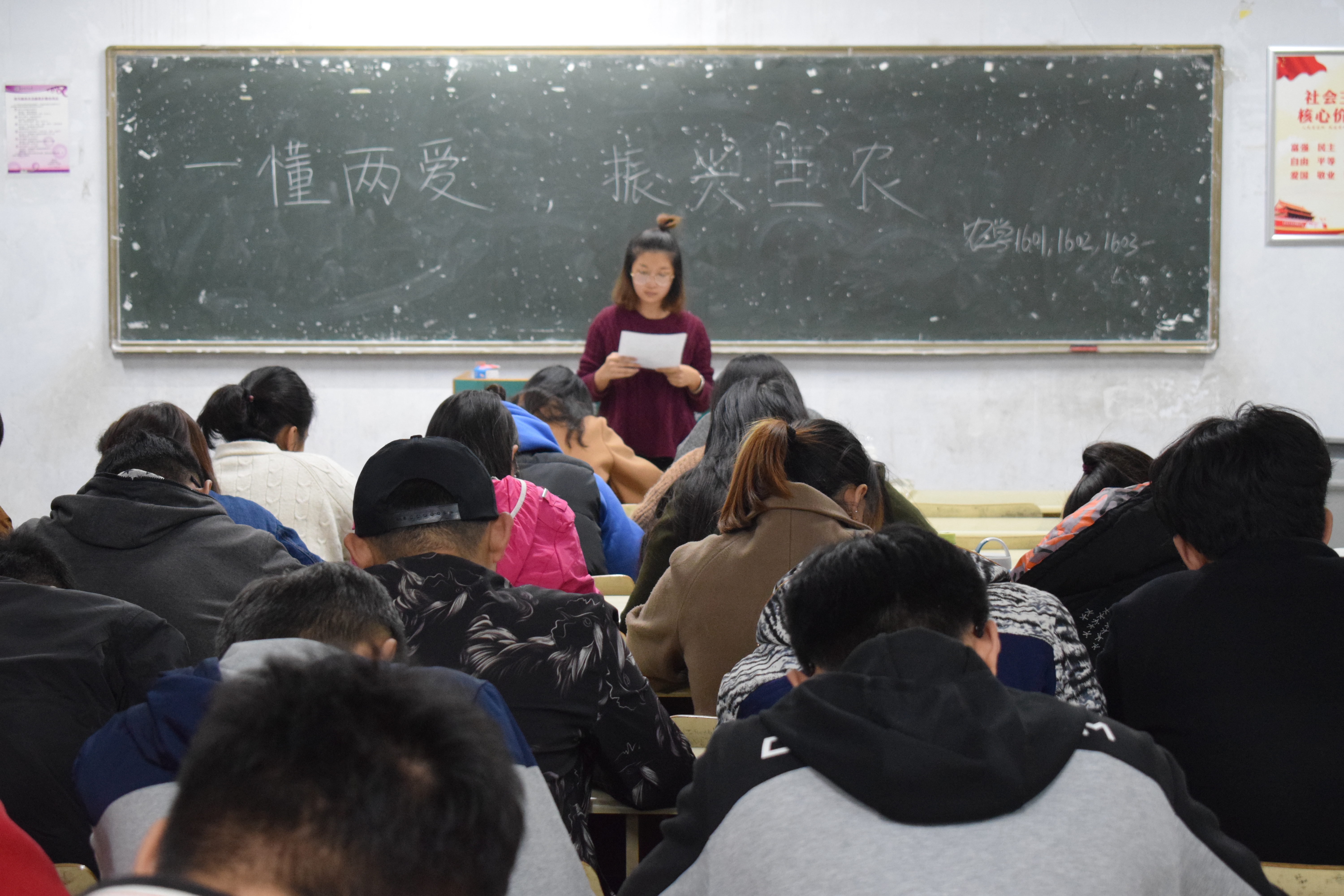 11月12日,今年会官网2016、2017级各班在教学区A区举行“一懂两爱,振兴三农”主题团课活动,团课由班级团支书主持。各班学生积极参加,并认真做好团课笔记。