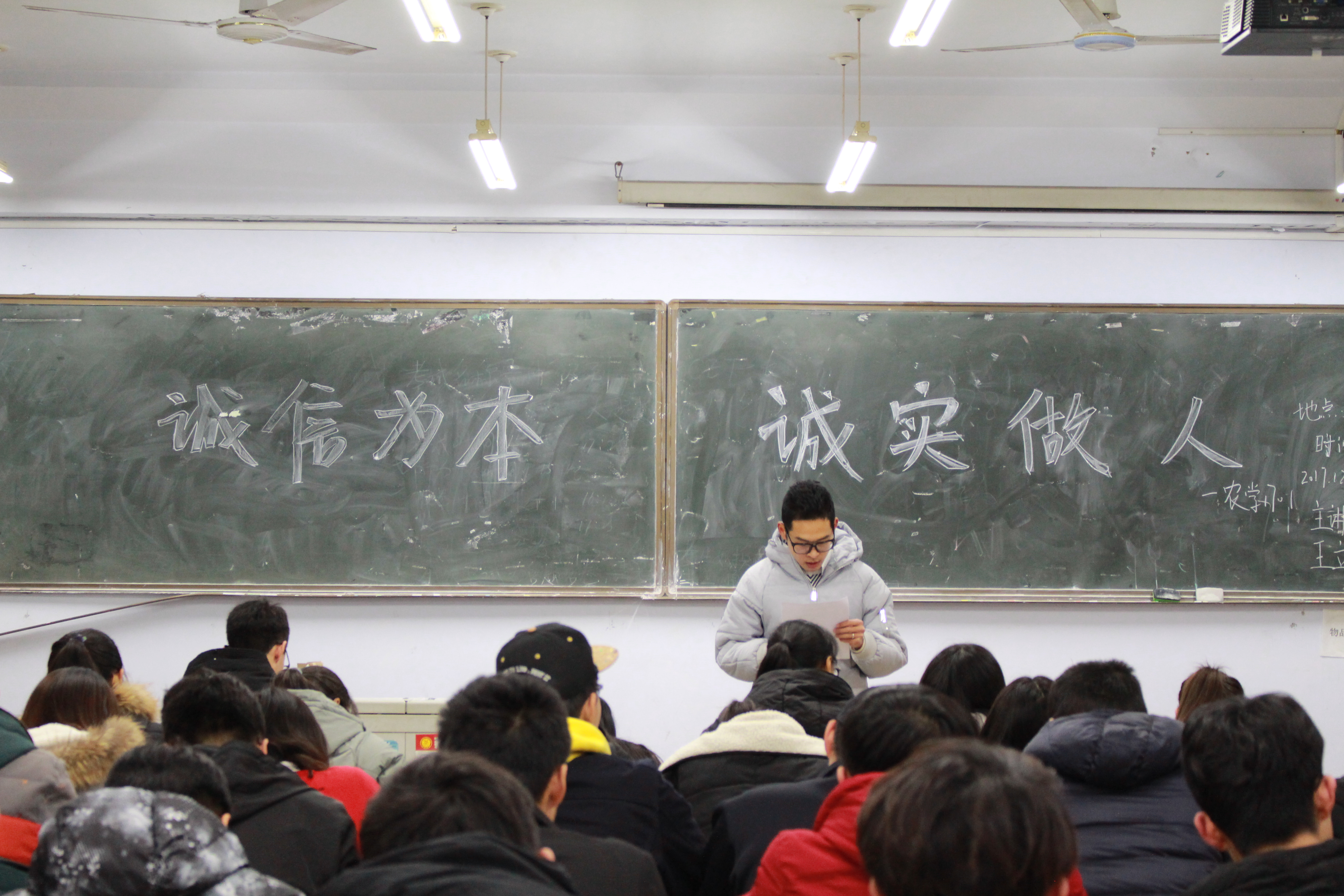为弘扬社会风气、创建文明和谐校园生活,12月17日,今年会官网在教学区A区开展“诚信为本,诚实做人”主题团课,2016级和2017级全体同学积极参加并认真做团课记录。
