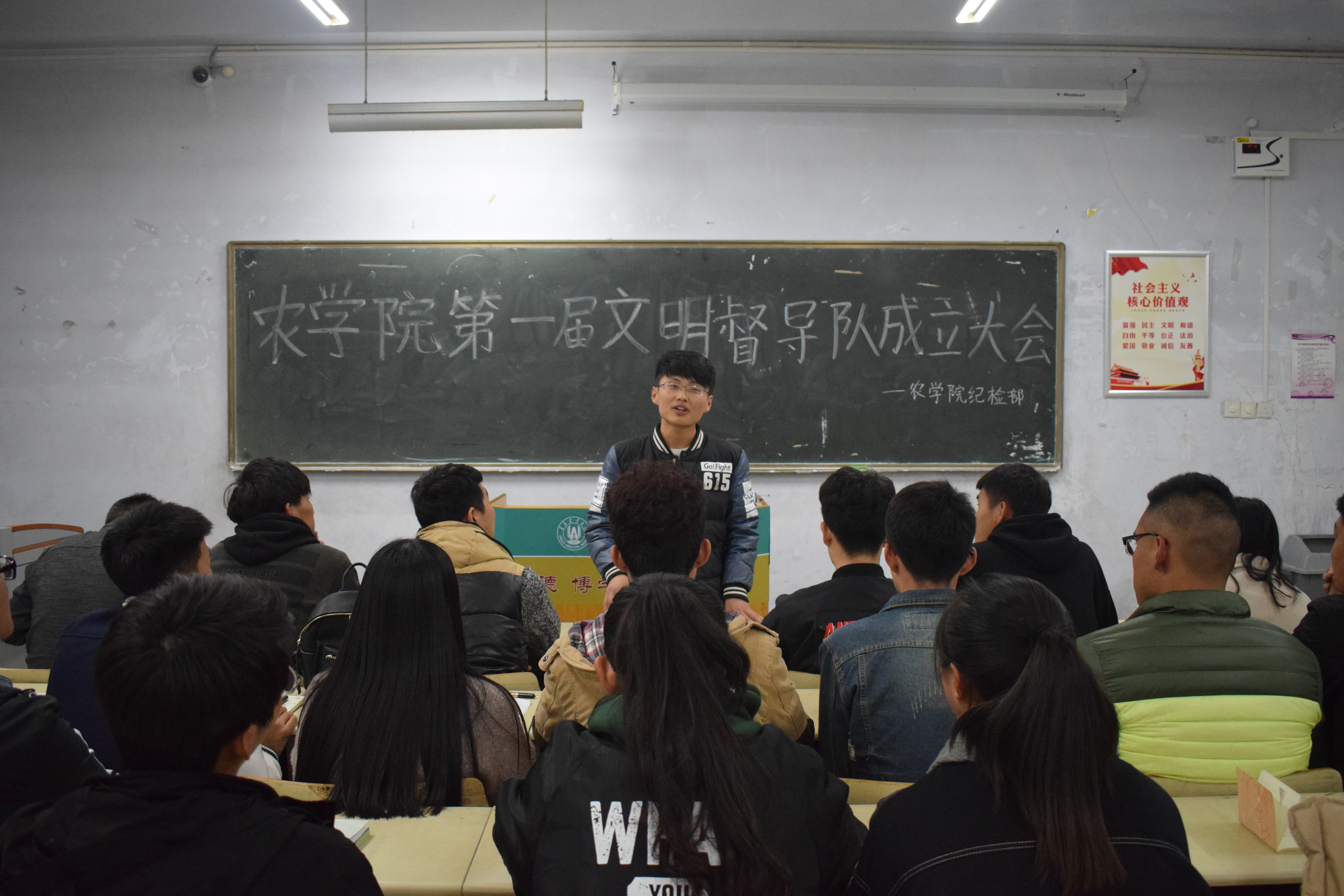 为引导学生树立良好的文明意识,提升学院各项服务和管理水平。 11月11日,今年会jinnianhuicom在教学区A区召开今年会官网第一届文明督导队成立大会,纪检部部长王太行、干事以及督导队所有成员参加此次会议。