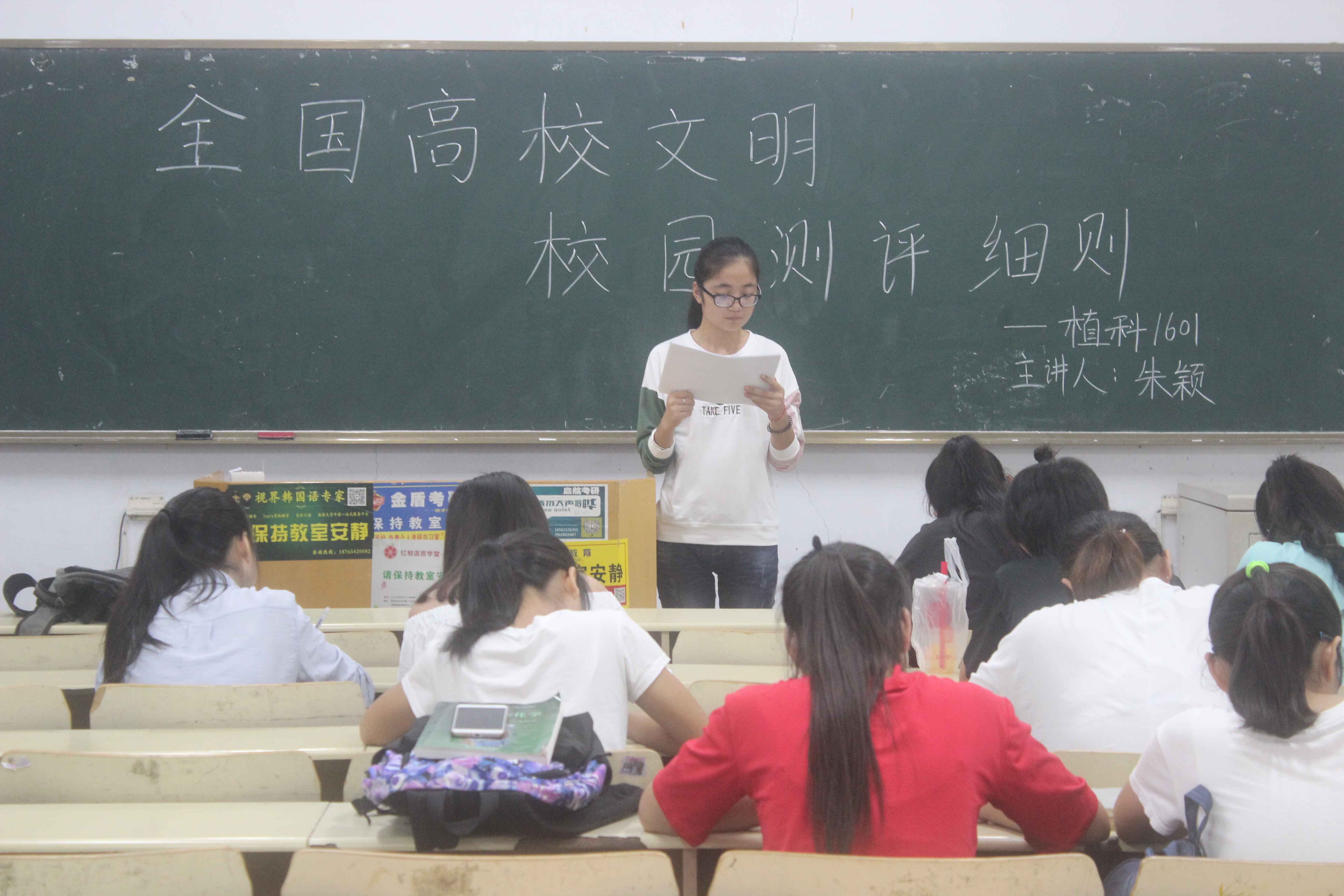 本次测评细则适用对象以全国高等学校为主,目的是明确文明校园创建任务,检验创建工作进展成效,为评选文明校园提供基本依据。团课上,各班主讲人介绍当前中国高校师生思想政治教育工作的开展情况,重点围绕大学生的思想道德建设问题,对当前校园存在的文明问题进行剖析,进一步明确“校园文明细则”建设的意义,并对其主要测评标准作了详细讲解。主讲人提出,希望同学们加强思想道德建设,积极参与院校活动,为校园文明出一份力;与此同时,时刻关心时政,紧跟党的思想引领,不断加强自身理论知识储备,提高自身思想境界,为国家的发展建设做好准备。