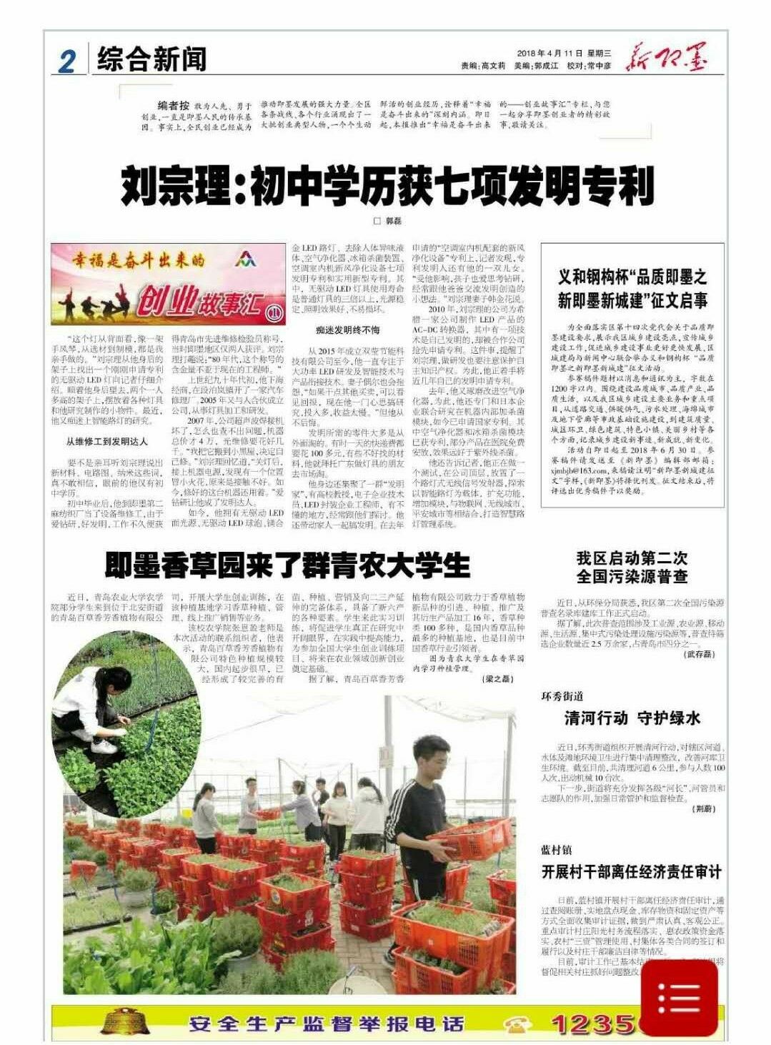 4月7日,由农学1701班级同学组建的一支创业实践团队,到青岛百草香芳香植物有限公司的种植基地进行了为期一天的实践训练,并荣登4月11日的新即墨报。