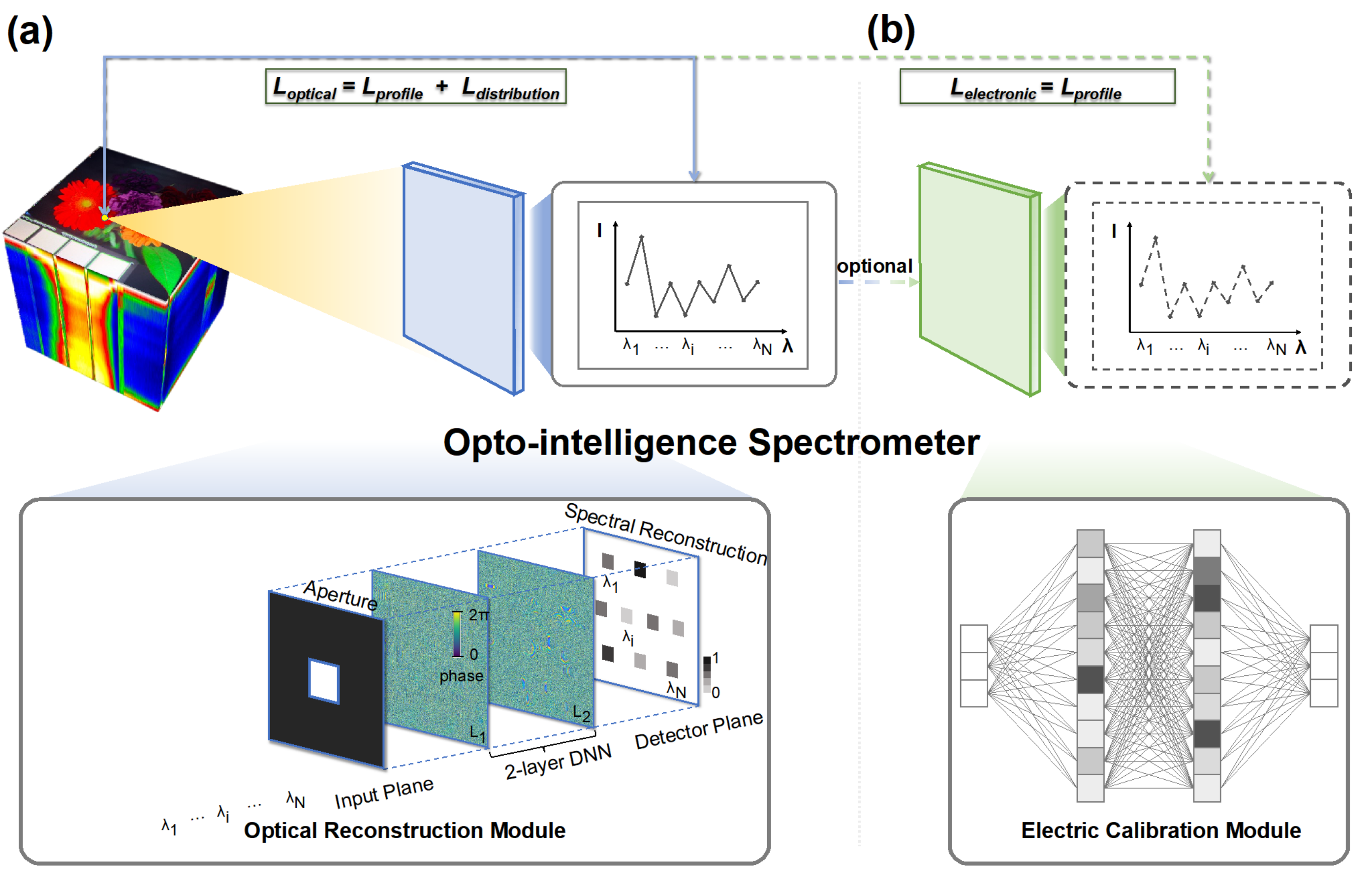 图1. 基于衍射神经网络的全光学智能光谱仪架构。