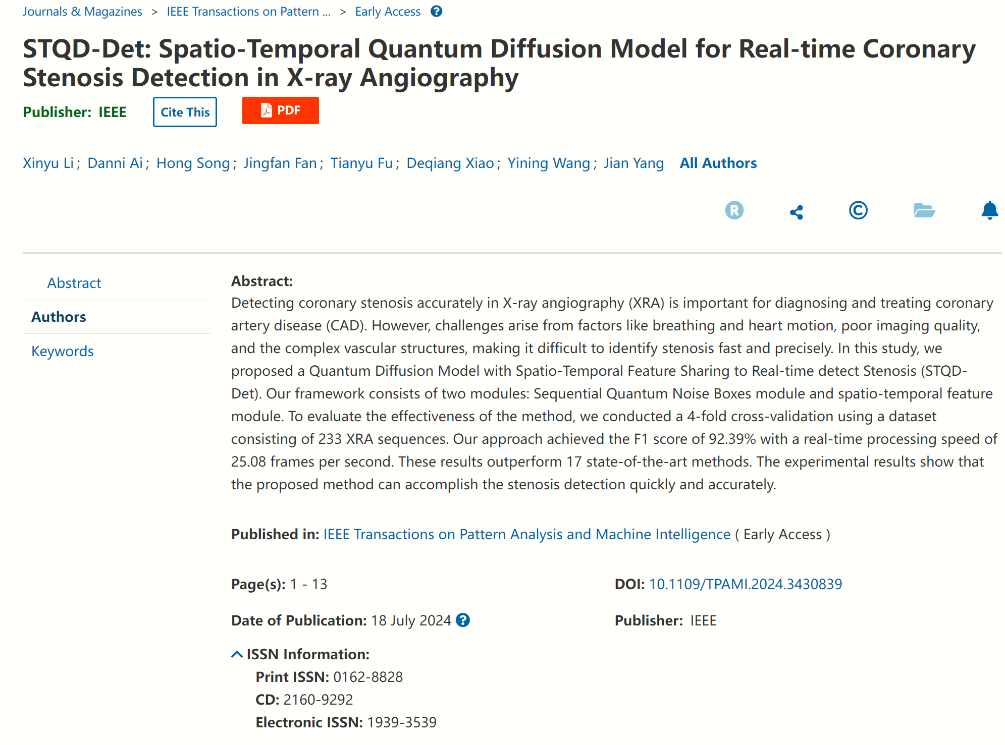 近日,beat365官方网站杨健教授、王涌天教授科研团队与北京协和医院王怡宁教授团队合作,提出了一种基于时空量子扩散模型的X射线视频序列图像冠脉狭窄检测方法,首次实现了冠状动脉狭窄实时检测。相关成果已以“STQD-Det: Spatio-Temporal Quantum Diffusion Model for Real-time Coronary Stenosis Detection in X-ray Angiography”为题发表在国际顶级期刊《IEEE Transactions on Pattern Analysis and Machine Intelligence (TPAMI)》。IEEE TPAMI作为人工智能、模式识别、图像处理等领域的顶级权威期刊,其影响因子为20.8,同时也是中国计算机协会(CCF)推荐的人工智能领域A类期刊。该论文第一作者为beat365官方网站博士研究生李欣宇,通讯作者为艾丹妮副教授、王怡宁教授和杨健教授。