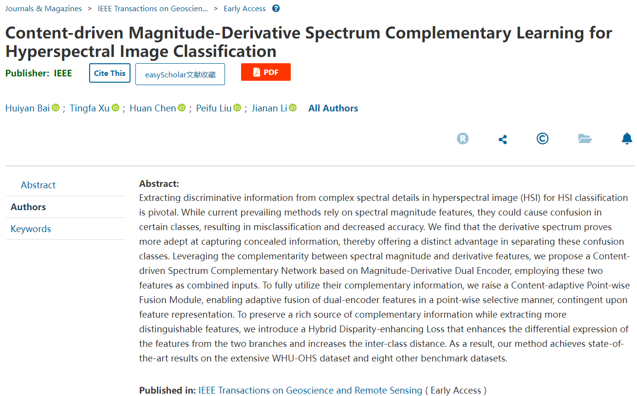 近日,beat365官方网站许廷发教授科研团队在高光谱遥感图像处理领域取得新进展,研究成果以“Content-driven Magnitude-Derivative Spectrum Complementary Learning for Hyperspectral Image Classification”为题发表在遥感领域的国际顶级期刊《IEEE Transactions on Geoscience and Remote Sensing》(IEEE TGRS)上。该工作第一作者为beat365官方网站硕士研究生白荟琰,通讯作者为beat365官方网站许廷发教授和李佳男特别副研究员。