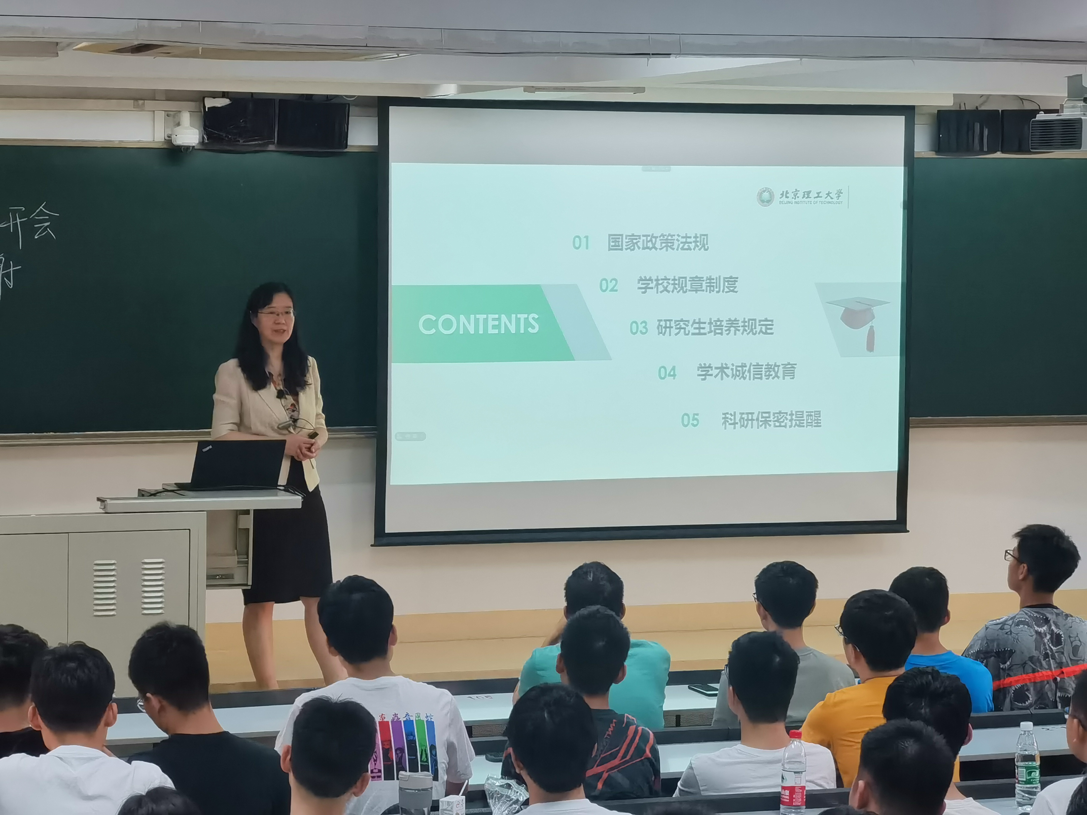 副院长王茜蒨给学生们进行了国家政策法规、学校规章制度、研究生培养规定、学术诚信教育和科研保密提醒等专项指导。通过列举研究生教学管理和学术学风的案例,希望同学们明确自身学习目标,积极与导师交流沟通,严格遵守学术道德、学术诚信和科研保密规定。