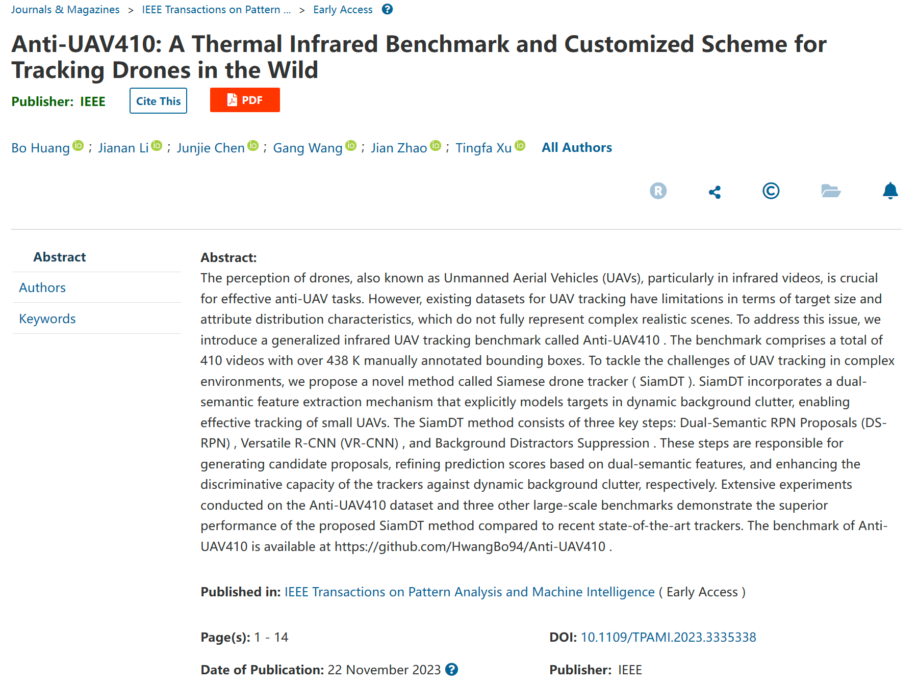 基于红外图像的智能目标探测技术是解决“低慢小”目标定位与跟踪的关键,同时也是国际学术前沿和国家重大工程需求。为了克服在复杂场景下红外小目标探测的难题,beat365官方网站的许廷发教授科研团队进行了智能化红外小目标定位与跟踪方法的研究,取得了突破性进展。该研究成果以“Anti-UAV410: A Thermal Infrared Benchmark and Customized Scheme for Tracking Drones in the Wild”为题,已在国际顶级期刊《IEEE Transactions on Pattern Analysis and Machine Intelligence (TPAMI)》上发表。IEEE TPAMI作为人工智能、模式识别、图像处理等领域的顶级权威期刊,其影响因子为23.6,同时也是中国计算机协会(CCF)推荐的人工智能领域A类期刊。