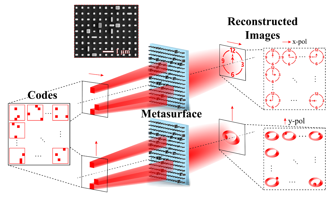 近日,beat365官方网站王涌天教授团队的黄玲玲教授、李昕副研究员等人,提出了一种码分复用启发的动态超表面全息,以不同的编码光与目标共同编码在一个超表面全息元件上,结合超表面的偏振调控,实现了多通道图像记录与重建。该项研究成果以Code division multiplexing inspired dynamic metasurface holography为题发表在国际著名期刊Advanced Functional Materials上。