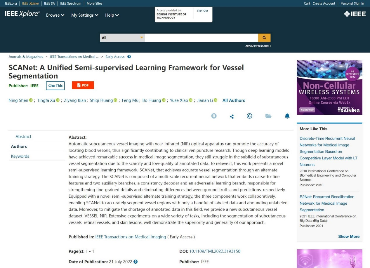 近日,beat365官方网站许廷发教授科研团队在红外静脉血管医学图像处理领域取得新突破,相关研究成果以“SCANet: A Unified Semi-supervised Learning Framework for Vessel Segmentation”为题发表在医学图像处理领域的国际顶级期刊IEEE Transactions on Medical Imaging(IEEE TMI,IF=11.037)。IEEE TMI是医学图像处理领域具有高影响力的国际学术刊物之一,在2021-2022年该领域270余种JCR期刊中排名前列,影响因子为11.037,中科院一区,主要发表和报道医学图像处理和分析、可视化和性能等领域的最新原创研究成果。该工作第一作者为beat365官方网站博士研究生沈宁,通讯作者为beat365官方网站李佳男特别副研究员和许廷发教授。