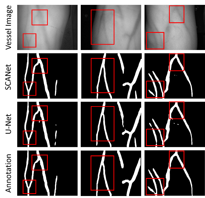 红外静脉血管穿刺技术(IR-Venipuncture)是利用近红外光学仪器进行皮下血管自动成像,实现智能红外静脉血管穿刺的技术。然而,红外静脉血管智能识别和分割是此项技术的瓶颈难题。针对这一科学难题,科研团队首次以血管分割效果和运行效率为双准则,提出了基于半监督学习的全自动近红外静脉语义分割模型SCANet,突破了这一关键技术。